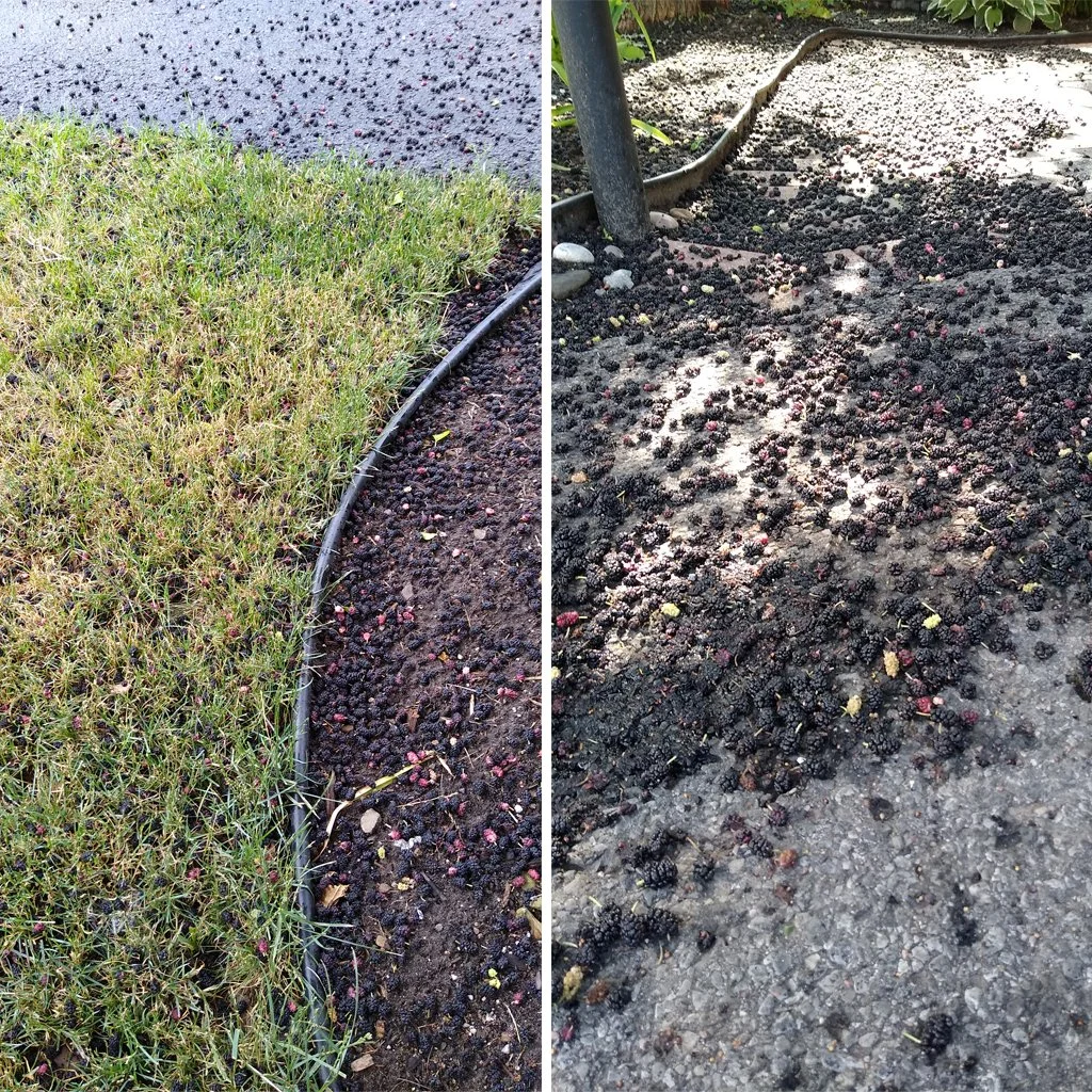 For the few weeks in summer when this great crop occurs, I daily sweep up surprisingly vast quantities of berries. And often, while I do it, I am indeed pelted by falling berries thanks to the breeze and/or possibly malicious birds. I feel I could slowly sweep all day and never have completely cleaned up the mess. The berries that fall in the gardens are the ones that get moldy, as they are a lot harder to collect. The green bin (a receptacle for collecting compostable items that is collected by the city weekly) gets so smelly and moldy with decomposing berries.