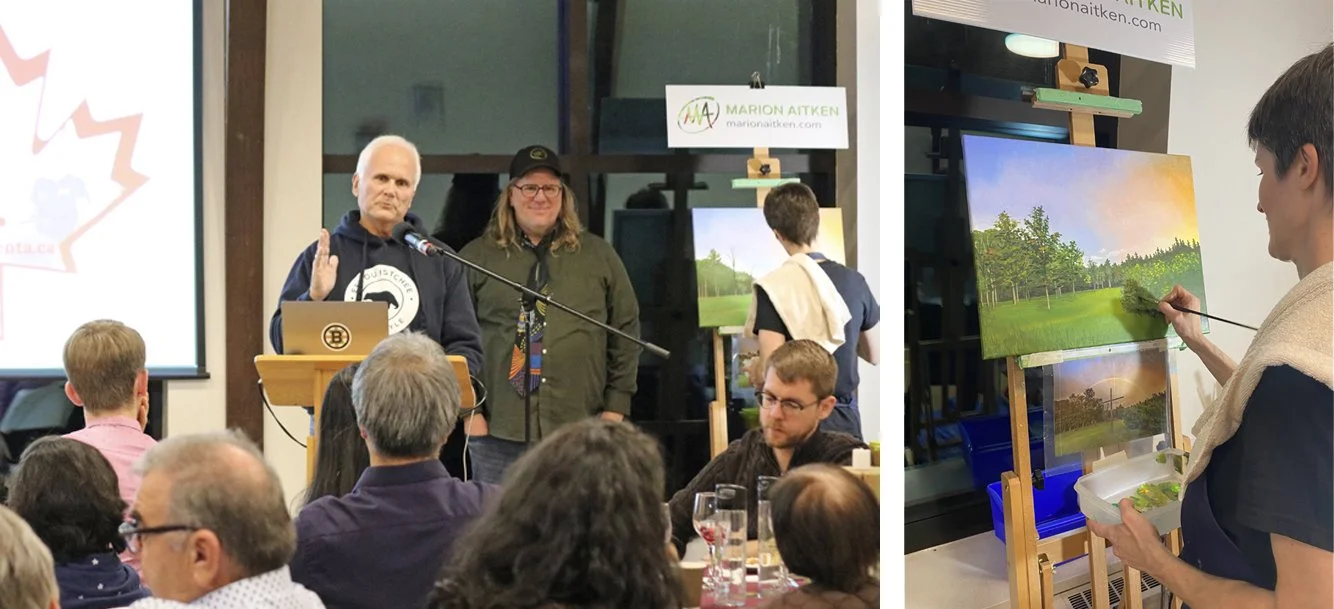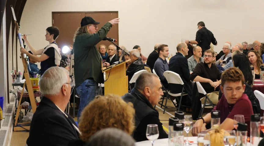 Eventually the moment of truth came when it was time for the live auction. At this point I had all the main background elements captured on canvas, but the main features, though simple, were still absent. Attendees were invited to come look at the piece up close, and view my reference photo to know what was “still to come” during a break before the auction. Bidding time arrived, and I sat down wishing I could be invisible. Funny the thoughts that came to mind then. I wanted to disappear so people wouldn’t pity me and place meager bids out of sympathy. This mindset reveals things that I dislike about my self-confidence levels. At the same time, I wanted the painting to fetch a great price so the fundraising organizers would feel validated and pleased at having invited me to participate. And yet, worse than “pity bids” would be no bids. That would be both demoralizing and humiliating – not to mention awkward for many people. Consequently, I felt great relief as the bids began. There was some fun ‘banter’ back and forth between bidders, some surprise bids that dropped in out of nowhere, and I am very grateful to say the winning bid was $625.